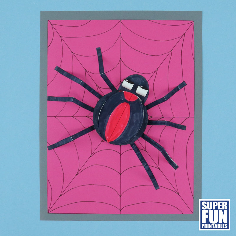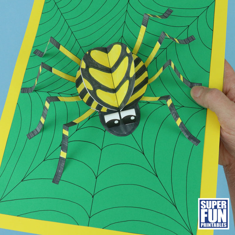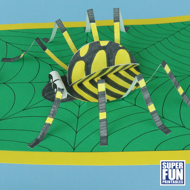 Make a paper spider sitting in her web using this printable template. The spider’s body, eyes and legs pop out from the page giving your spider a 3D effect.