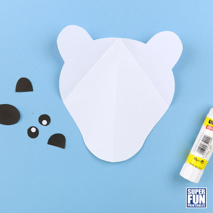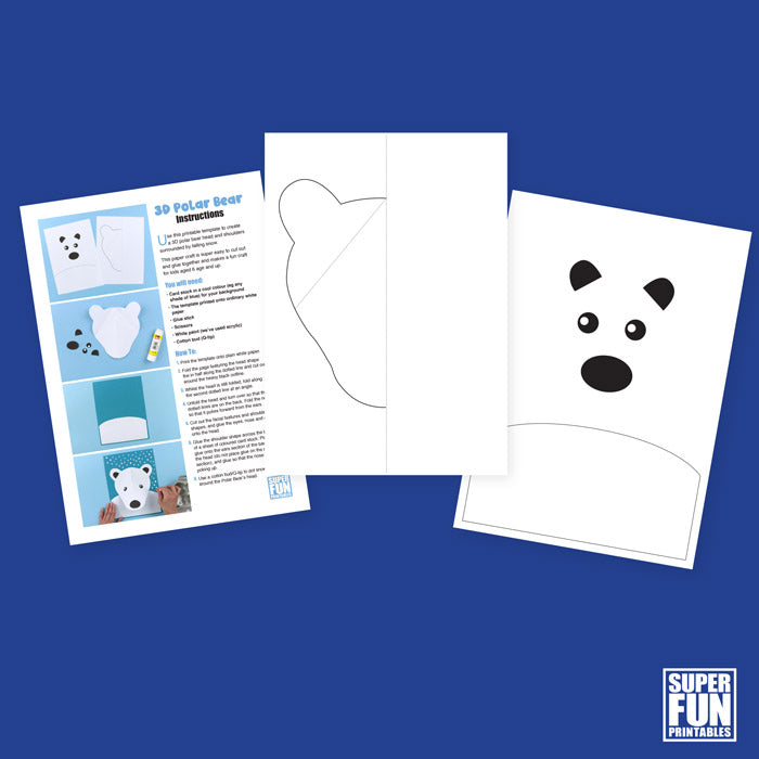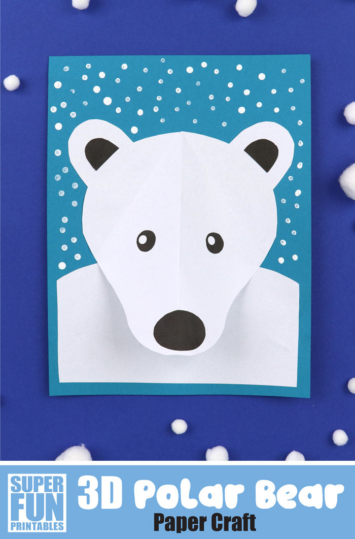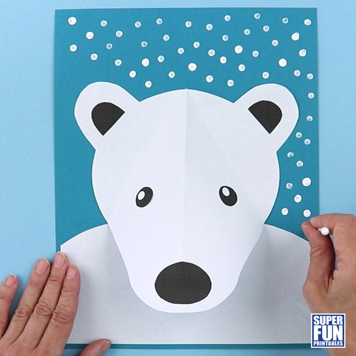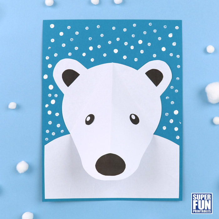 Create a 3D polar bear paper craft featuring a bear's head and shoulders surrounded by falling snow. The nose pokes out from the page giving the artwork a fun three dimensional effect, which looks effective hanging on the wall in your home or classroom.