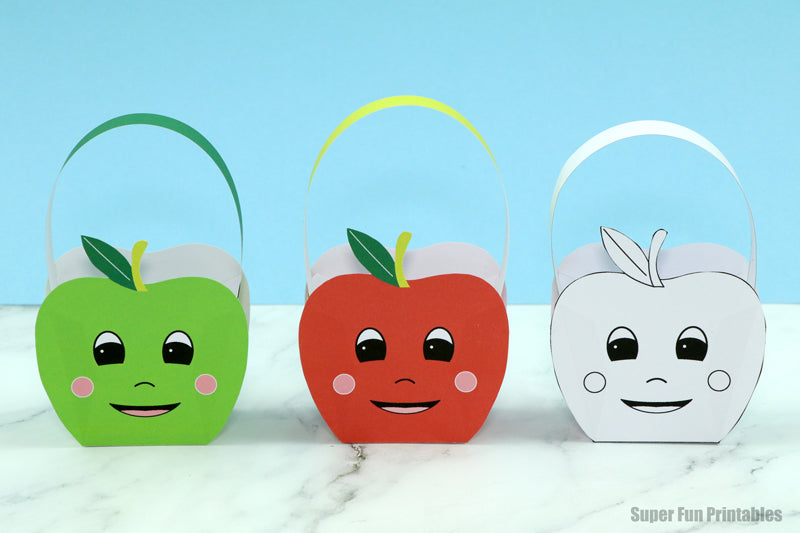 The finished baskets are approximately 80mm wide x 140mm tall (5.5x3.25"), including handle, and come in red, green and line art so kids can colour their own.