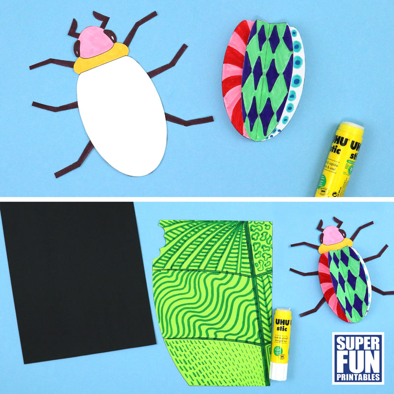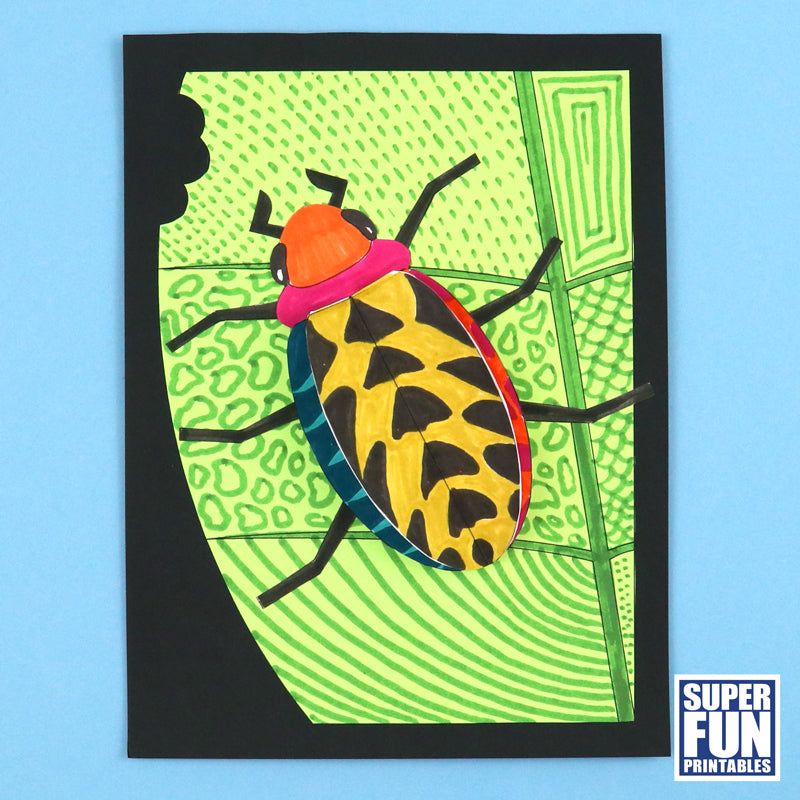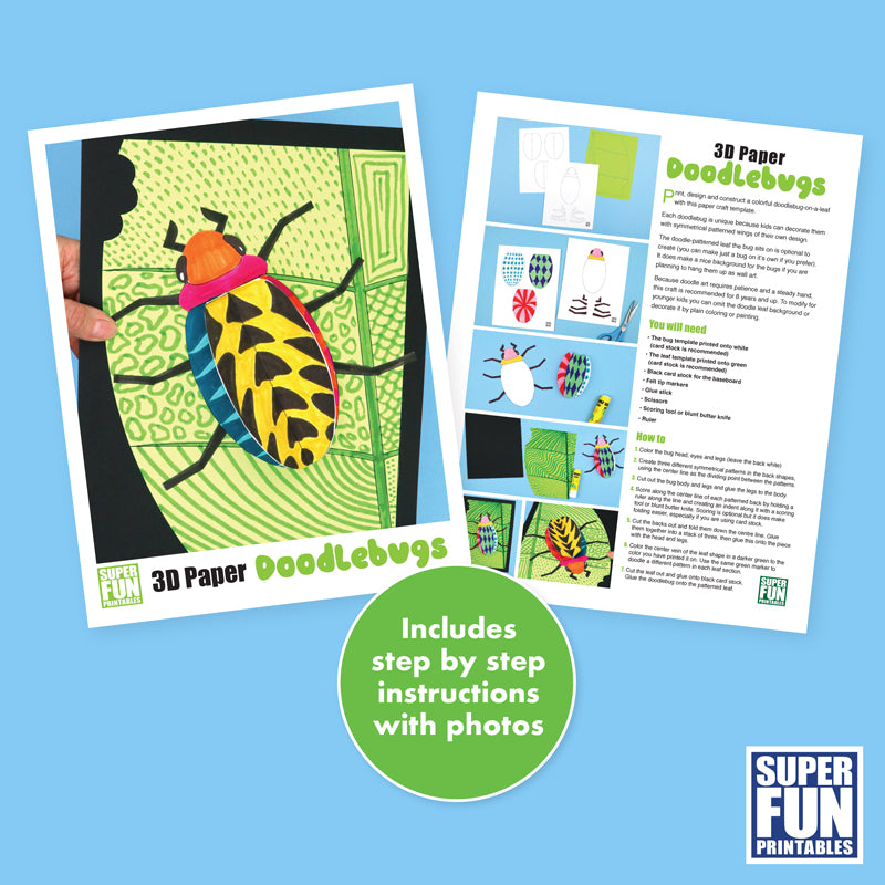 Create a 3D paper doodlebug-on-a-leaf using this template. Each bug is unique because kids can decorate them with symmetrical patterns of their own design.