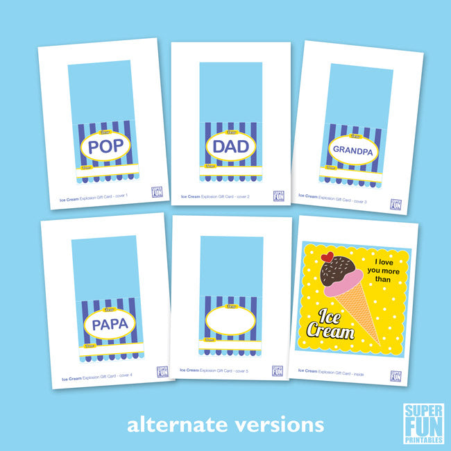 • Ice cream card in both full colour and colour-your-own with five alternative covers (Dad, Pop, Grandpa, Papa and blank space)