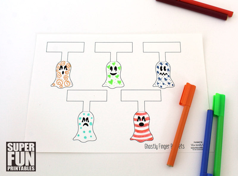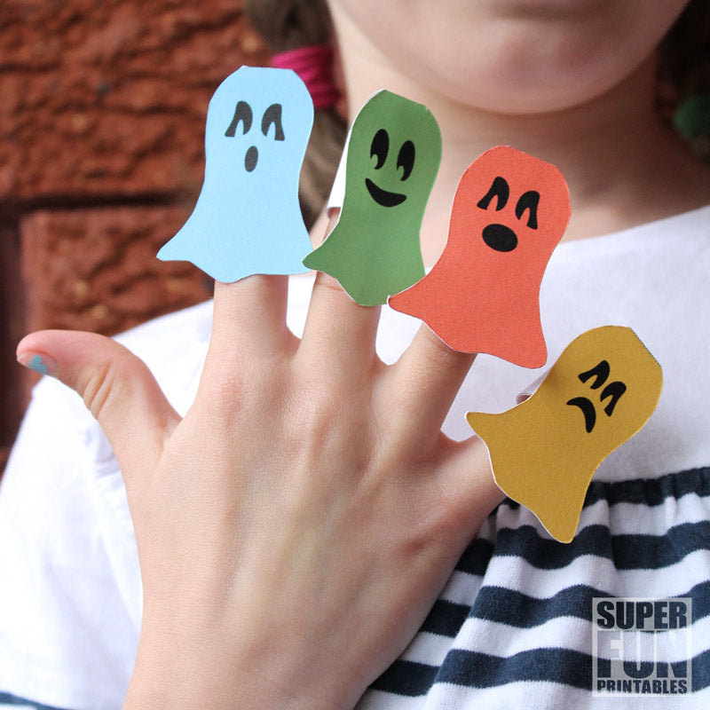 Make some simple ghost finger puppets for imaginative play. This set of five puppets has one for each finger and is very quick and easy to make. There is also a black and white version so kids can colour their own.