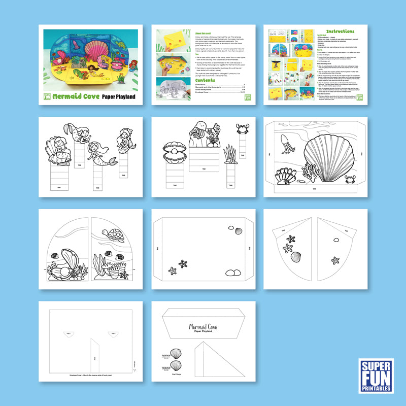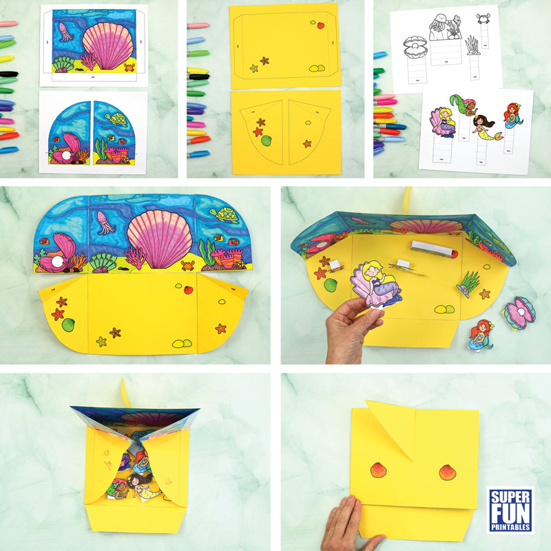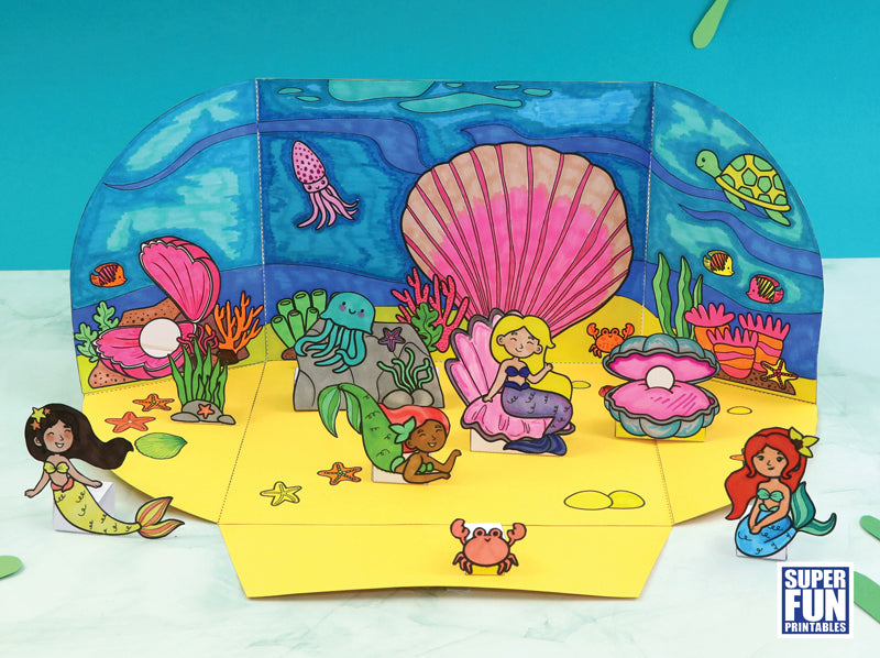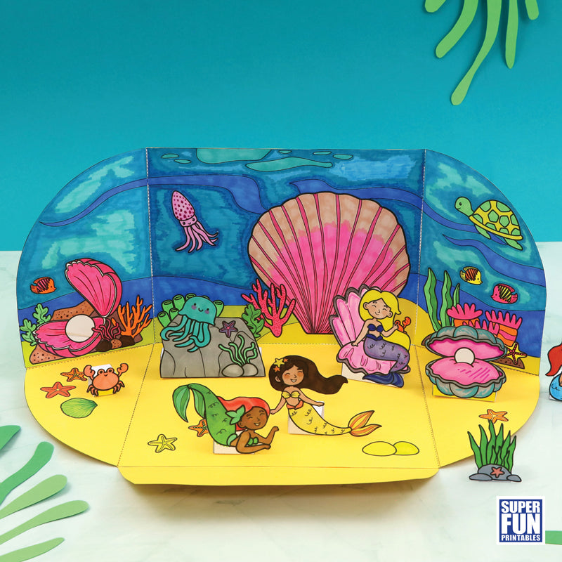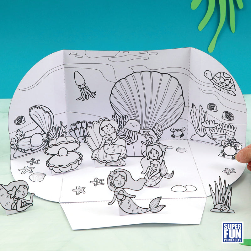 Create a fold-away Mermaid Paper Playland with this printable template. Colour the backdrop and mermaid characters, then cut, fold and make the craft.
