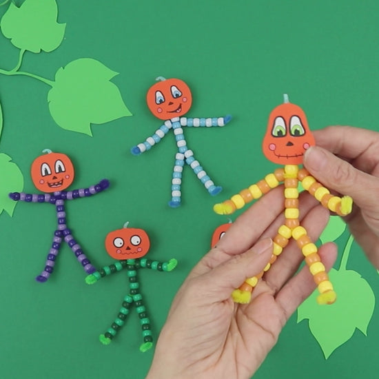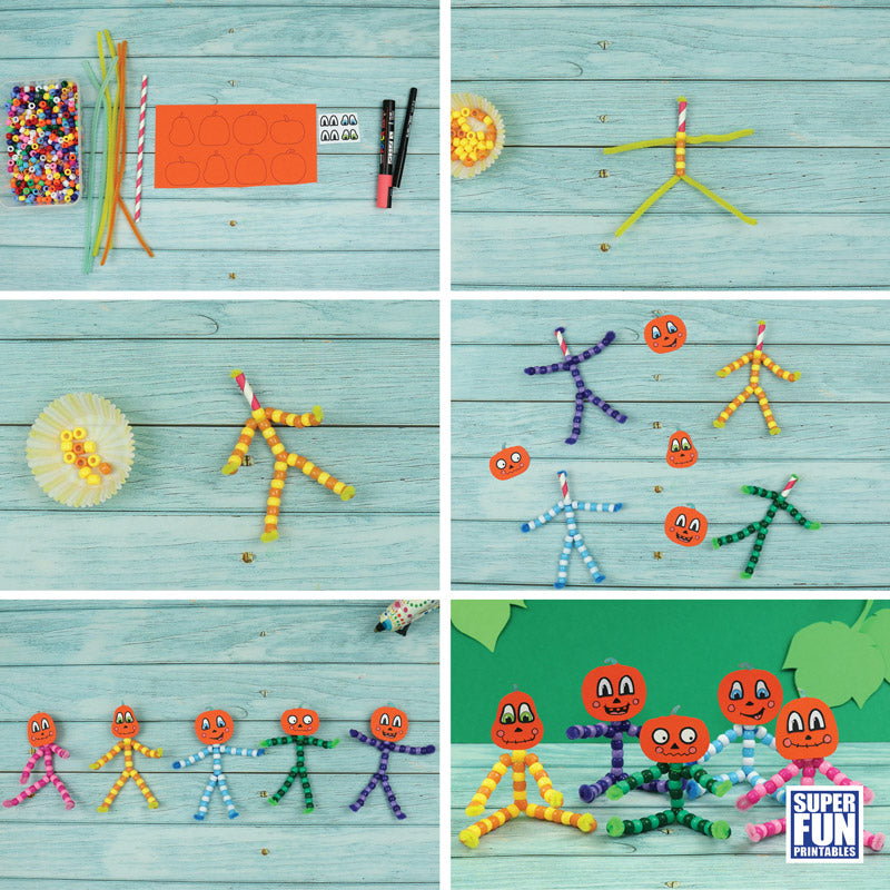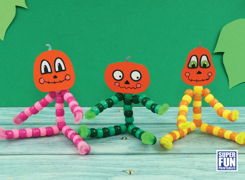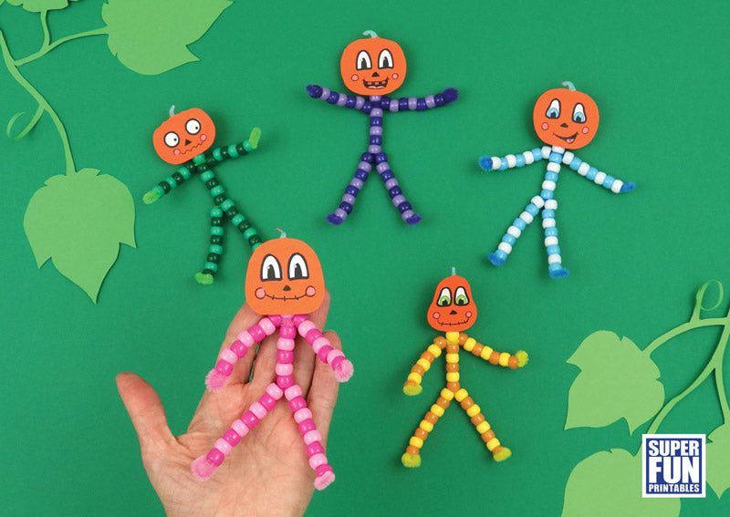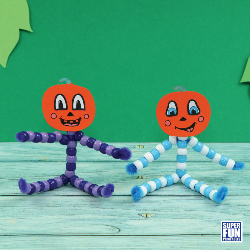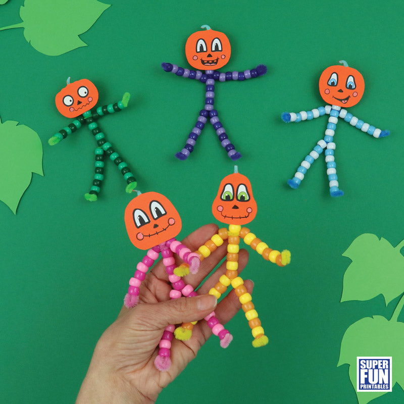 The template includes printable pumpkin head shapes and glue-on eyes. Draw the rest of the face and add pipe cleaners threaded with pony beads to create bendy bodies. You will need a hot glue gun for this craft.