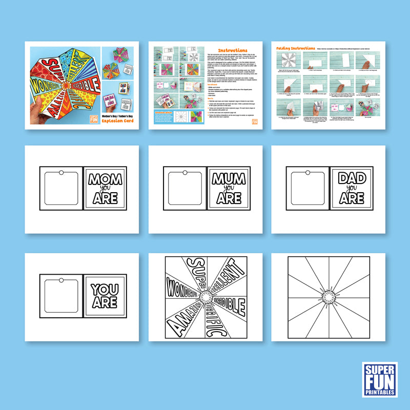 The 'explosion' effect is created using a folding technique that tucks a square page inside a smaller, square card base. When you open the card, the design pops open! Printable step-by-step photos and instructions are included in the template.