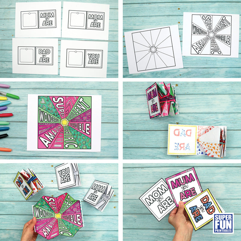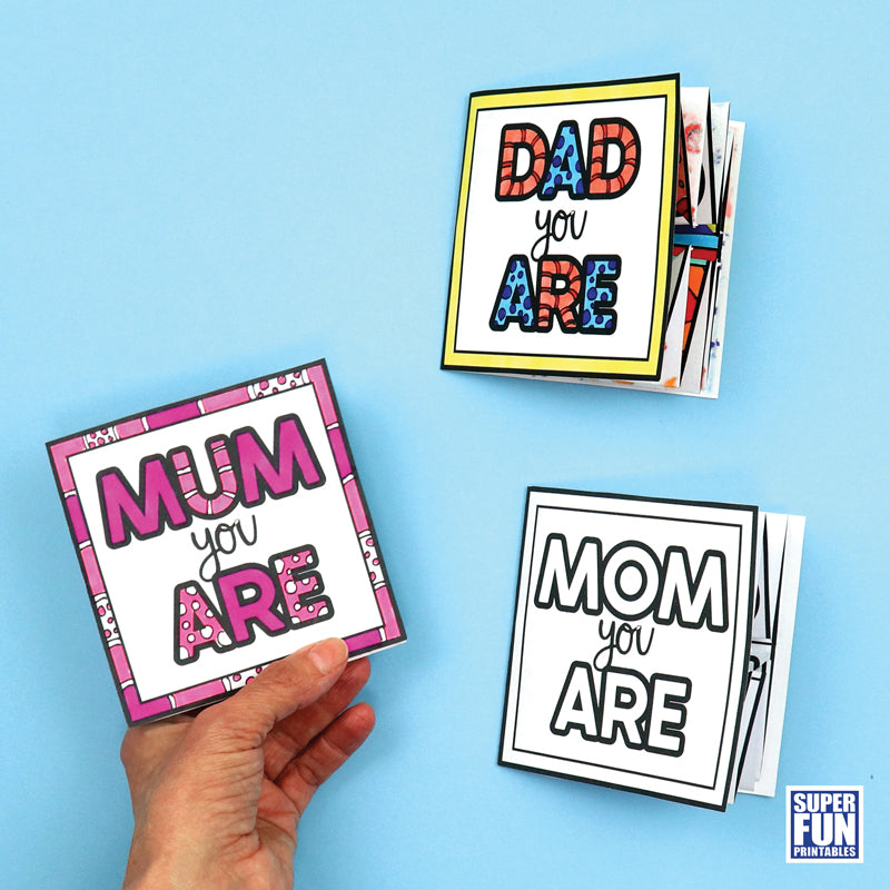 The card features US and international spellings of Mom and Mum, a Dad option plus a generic 'You Are' option for parents and carers who are called something else.