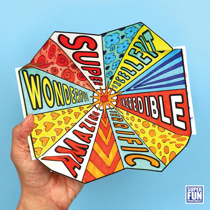 There is a pre-printed set of positive describing words to colour and decorate with doodle art patterns, plus the option of a blank starburst design that you could fill in with your own describing words.