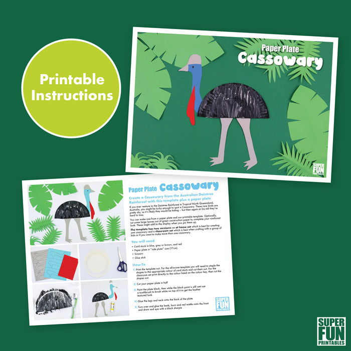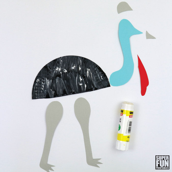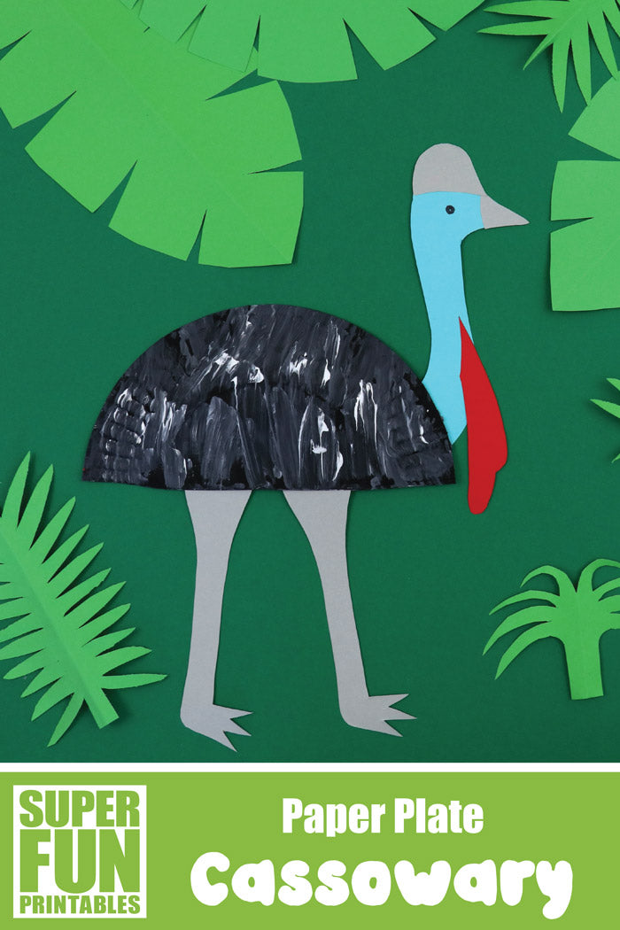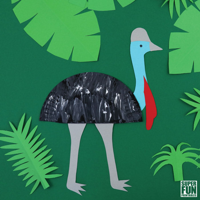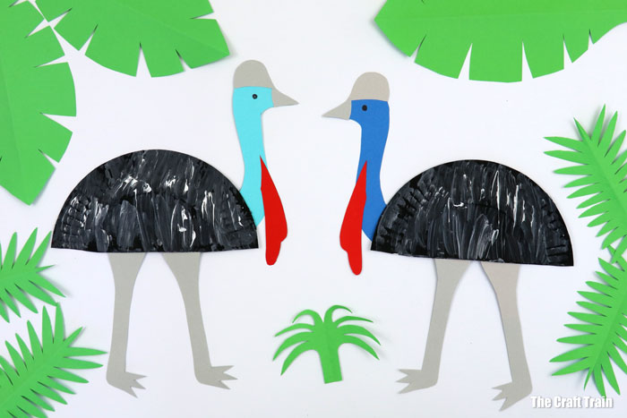 Paint a paper plate half (size needed: 17cm/7"), then glue on the paper legs and head on to create your cassowary. They look fabulous hanging on the wall!