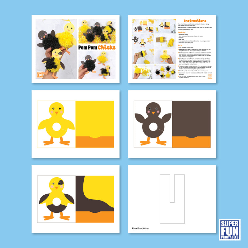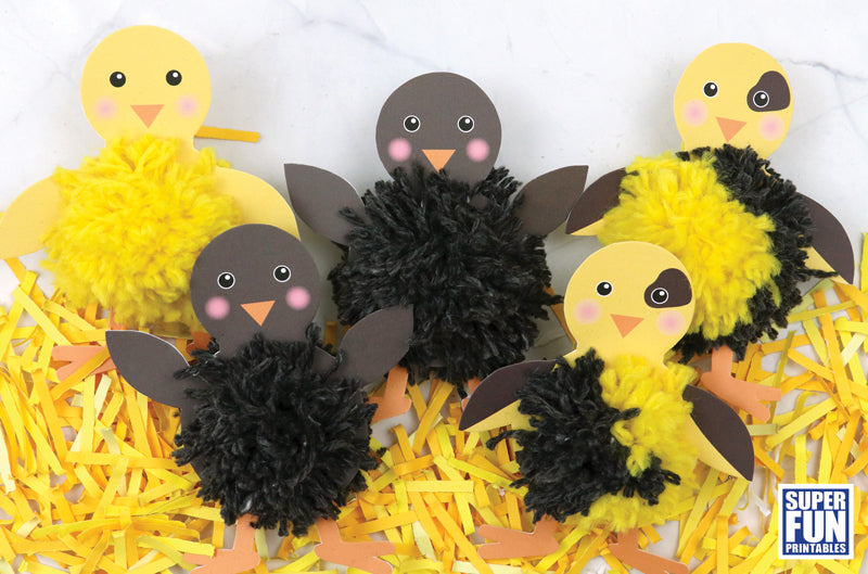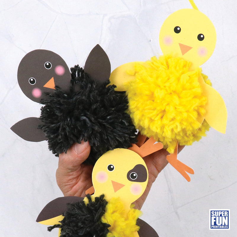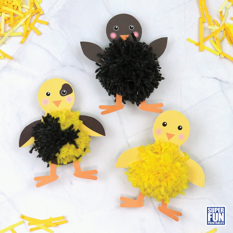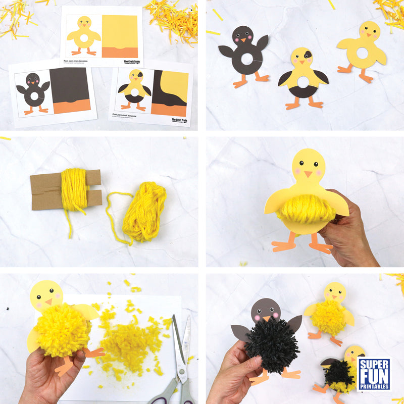 Make a super cute and fluffy pom pom chick. This is a fun pom pom craft for Spring or Easter and the template includes instructions for a DIY cardboard pom pom maker.