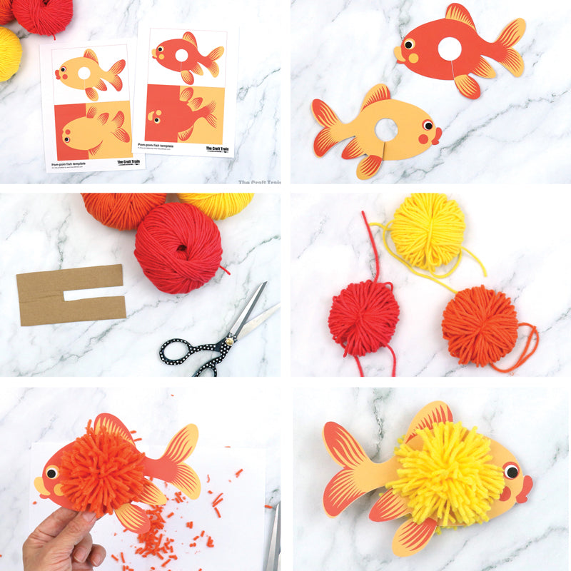 The pom pom is created using a DIY pom pom maker (template and instructions included). Insert the partially made pom pom into the fish frame before cutting and trimming to make your fish.