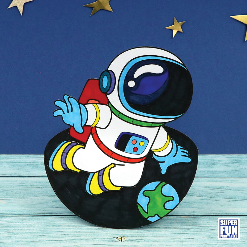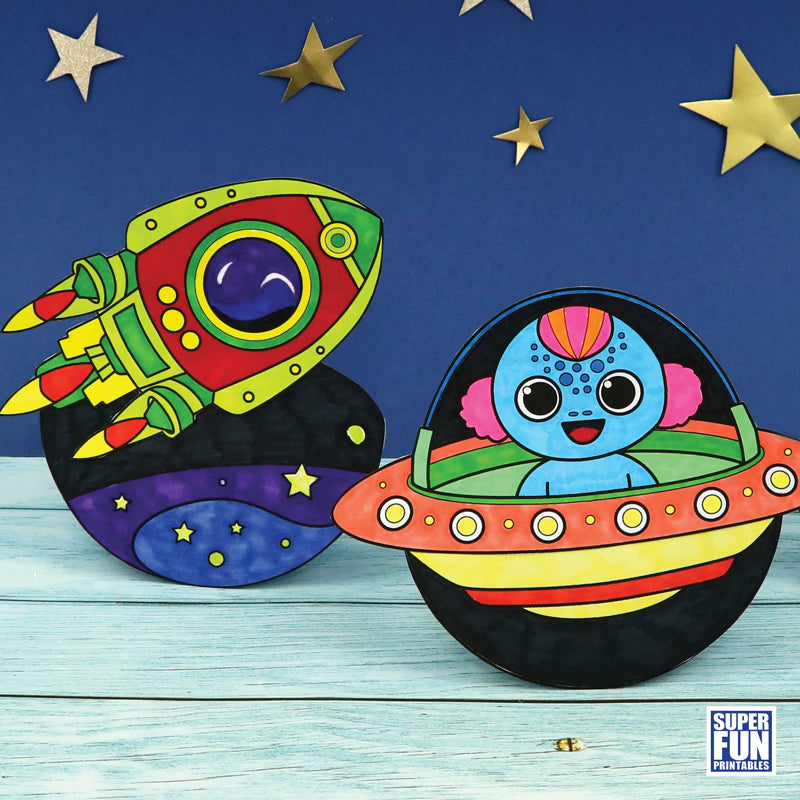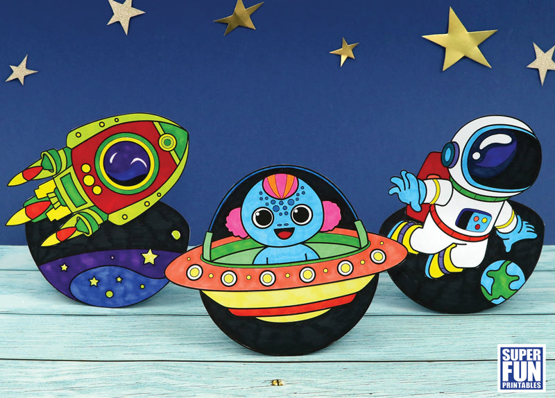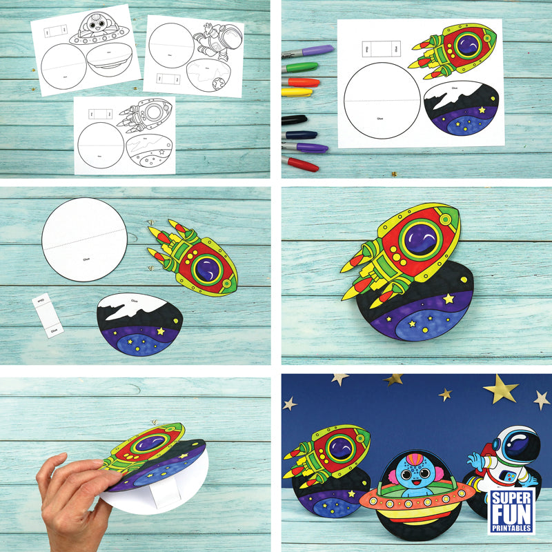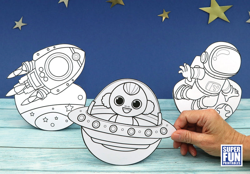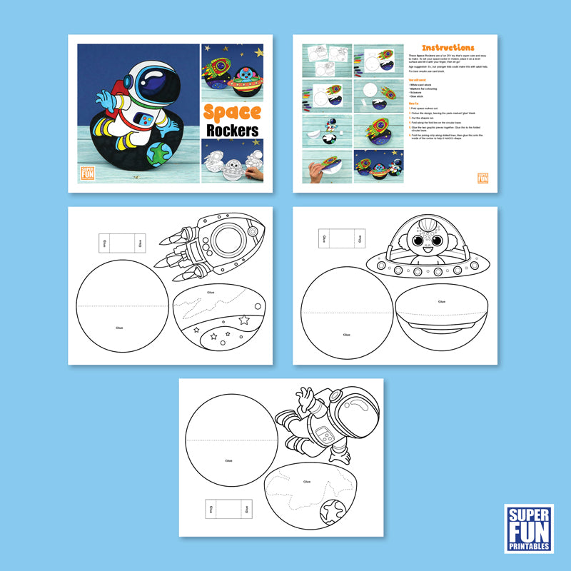 There are three rockers to make: A rocket, an astronaut and an alien. They are super easy to put together, involving colouring and basic papercraft skills such as folding and gluing.