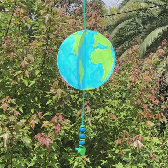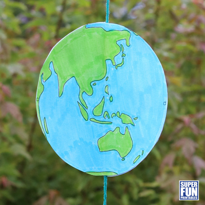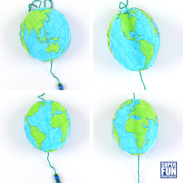 Colour in the shapes, cut out and glue together with some string through the middle, then add beads to complete your spinning earth craft. Hang in a spot where it catches the breeze and spins in the wind.
