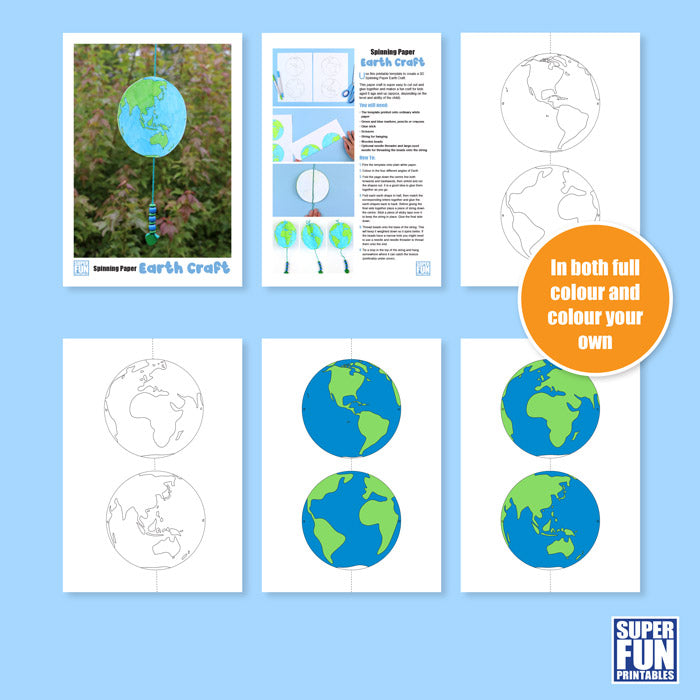 Make a spinning paper planet earth using this printable template. The template comes in both full colour and colour your own and includes a stylised illustration of the planet from four different angles. The smoother lines and reduced detail make it easier to colour in.