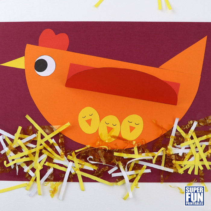 Geometric paper chicken - this mother hen is put together from a selection of geometric shapes and has three baby chicks tucked under her wing