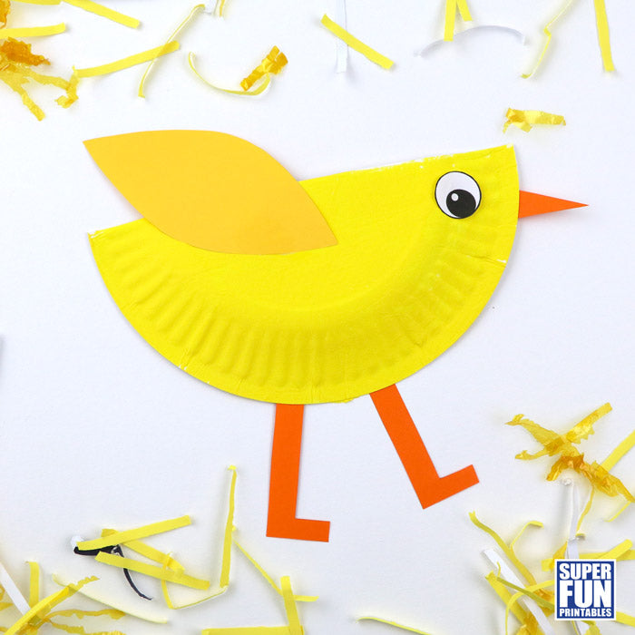 Paper plate chick - this paper plate chick is super easy to make by gluing the printable shapes onto a painted half paper plate
