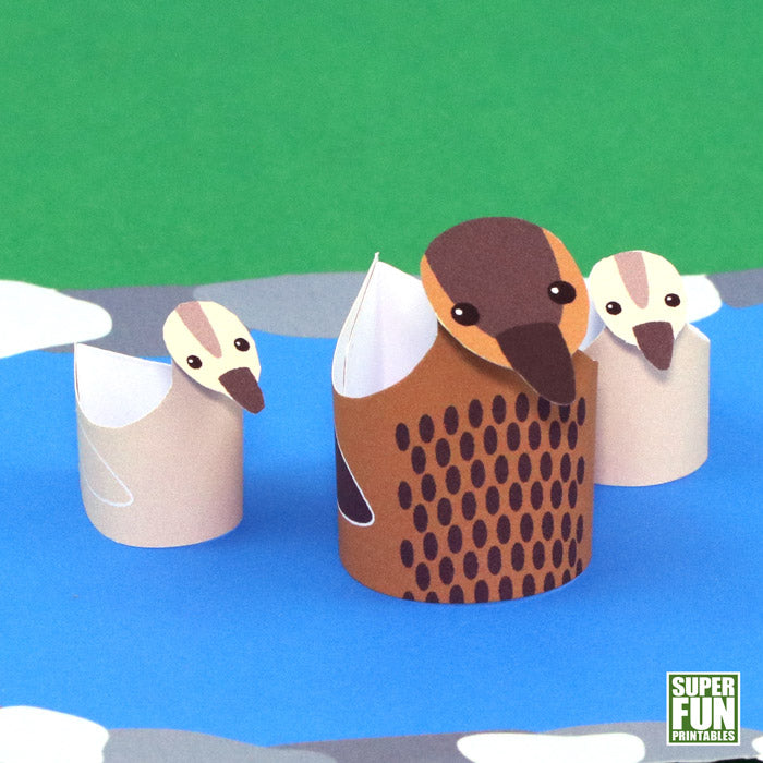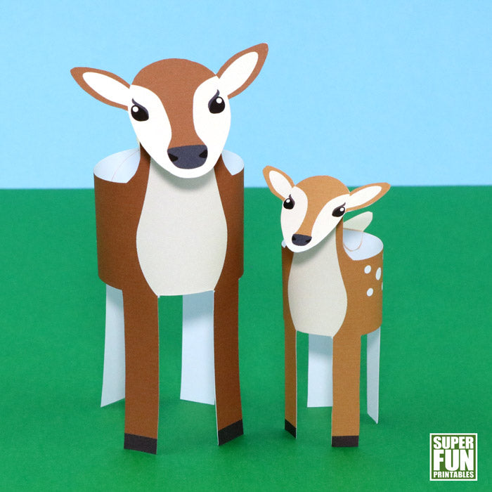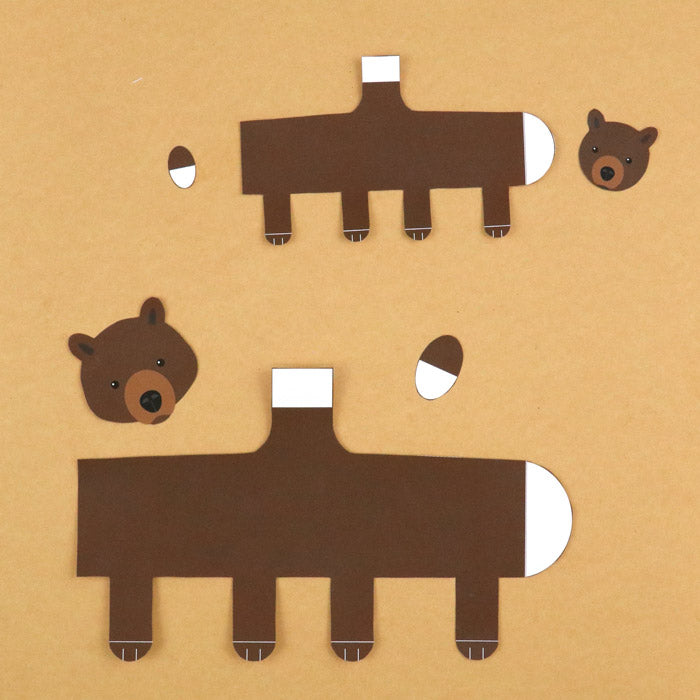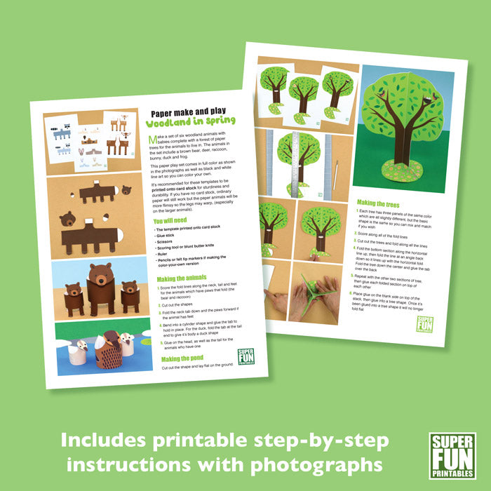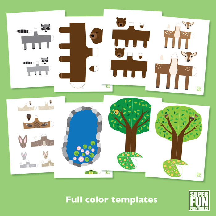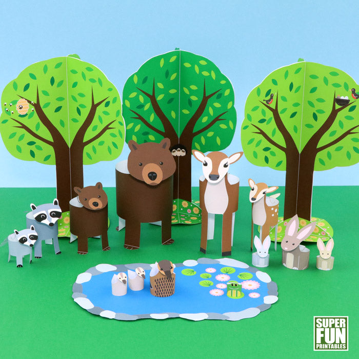 Animals included in the set are deer, bears, raccoons, bunnies, ducks and a frog. All paper animals (except for the frog) have a mother and baby version to make.