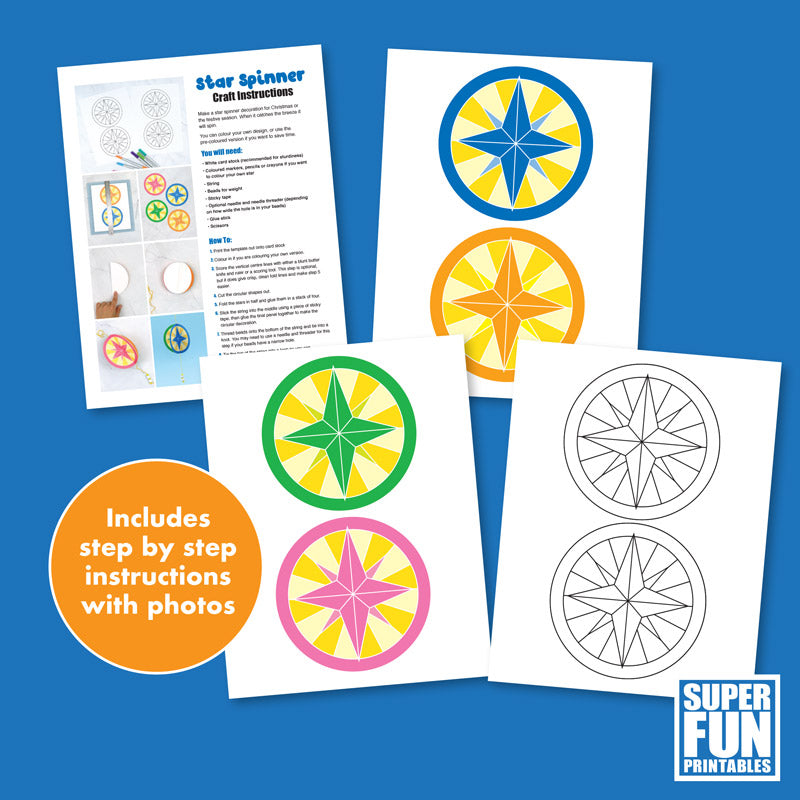 This is a fun kids' craft for Christmas or New Year. You can colour your own stars, or use the pre-coloured version to save time.