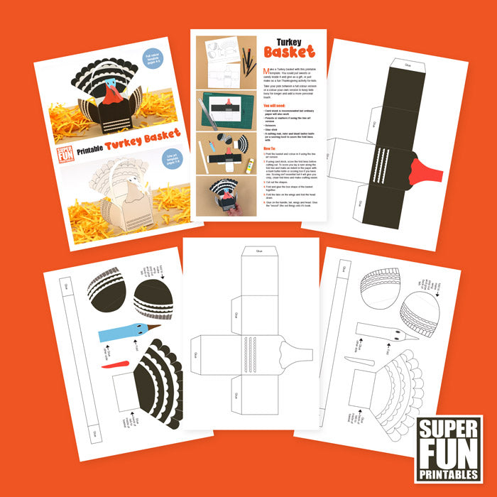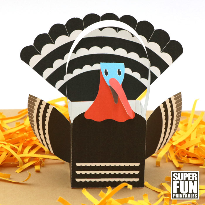 Make a realistic-looking 3D paper turkey basket using this printable template.